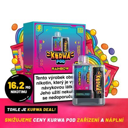 Rainbow příchuť spojuje svěží trpkost limetky, sladkokyselou čerstvost pomeranče, bohatou chuť černého rybízu, šťavnatou sladkost jahod a citrusovou svěžest citronu. Je to Kurwa mix chutí, která při každém potáhnutí rozmazluje chuťové pohárky. Připomínající chutě bonbónů skittles!