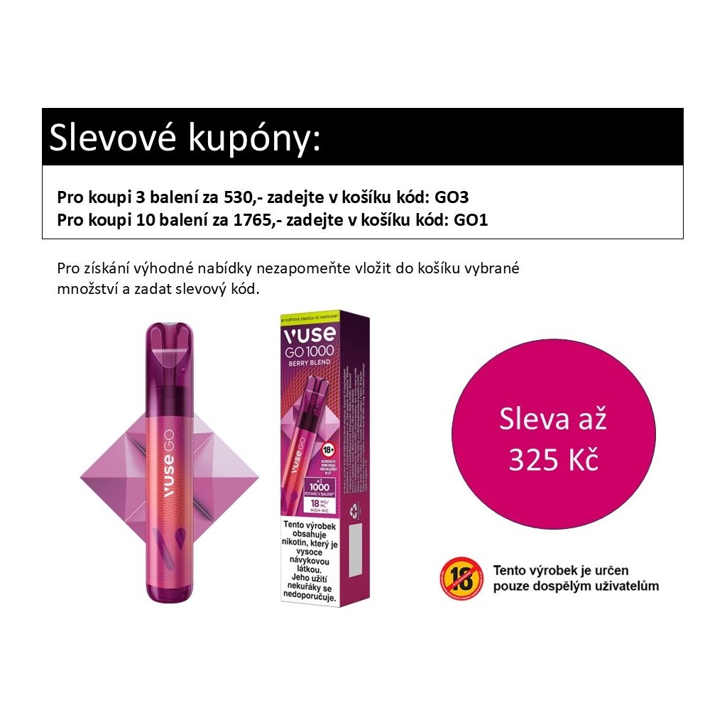 Intenzita nikotinu: 18 mg/ml, celkový obsah nikotinu v každém zařízení Vuse GO 1000: 36 mg