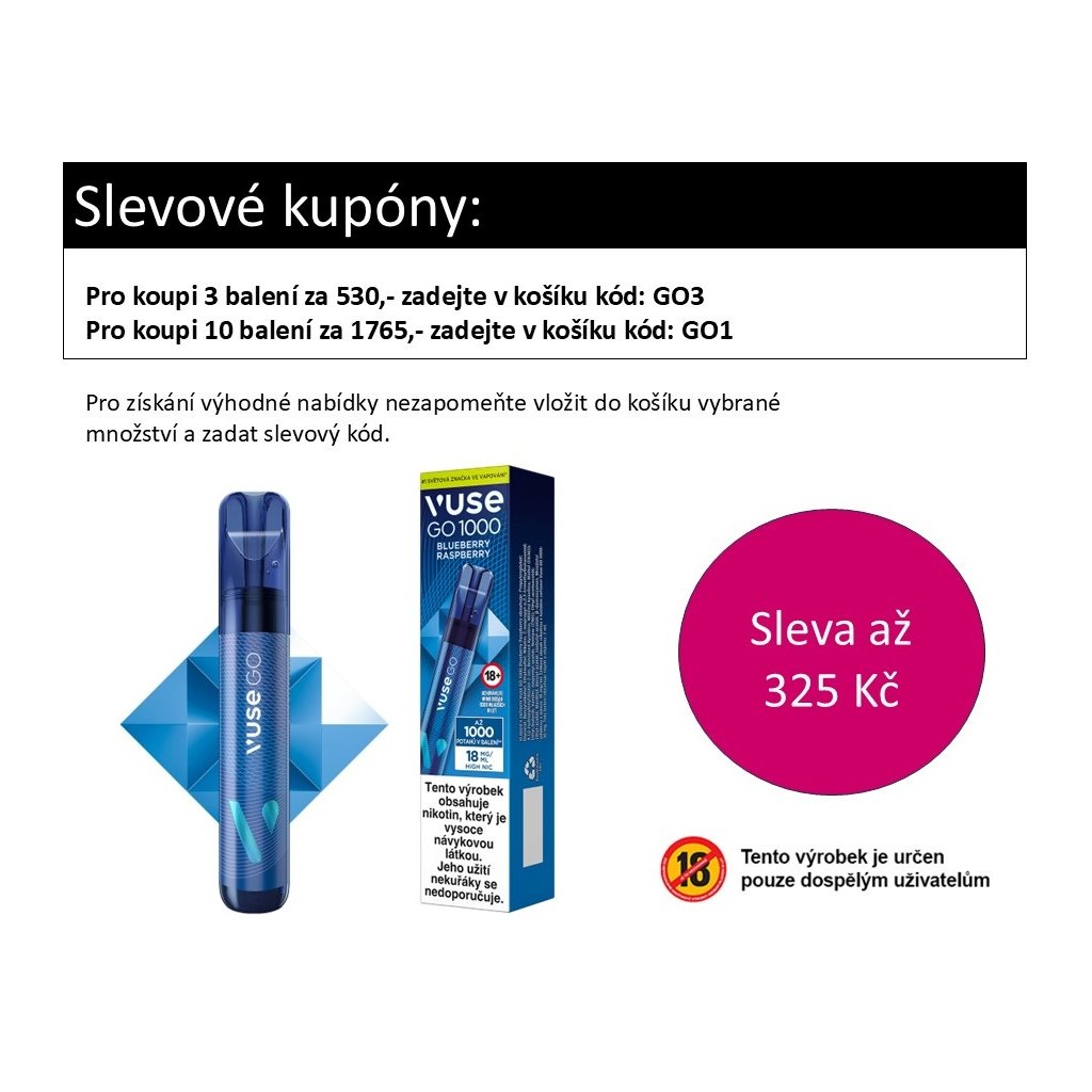 Intenzita nikotinu: 18 mg/ml, celkový obsah nikotinu v každém zařízení Vuse GO 1000: 36 mg